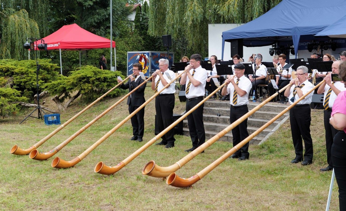 Das Programm auf der Bühne begann mit den Kindern des Hortes der Grundschule Mölkau. Also gleich zu Beginn ein Highlight für die Familien in Mölkau. Danach erfreute die Kinder ein musikalisches Puppenspiel mit Julia Dathe und ihrem Team. 16.30 Uhr hielt ein Reisebus aus der Schweiz in der Gottschalkstraße, dem 25 Musiker mit ihren Instrumenten entstiegen und sich kurze Zeit später auf der Bühne formierten. Der Musikverein „Harmonie Rickenbach“ aus der Schweiz gastierte in Mölkau. Der Dirigent des Musikvereins, Herr Johannes Schubert ist in Mölkau geboren und ist hier zur Schule gegangen. Er hatte angefragt, ob sein Musikverein in seinem Geburtsort auftreten kann. Es wurde ein weiteres Highlight an diesem Nachmittag, bei dem sogar sechs Alphörner zum Einsatz kamen. Danach wurde die Bühne frei für Ralph Schüller & Band. Mit sechs Begleitmusikern bot der Liedermacher Ralph Schüller mit eigenen Songs ein Konzert der Extraklasse. Harmonisch, melodisch, rockig, poetisch spielte sich die Band in die Herzen der Zuhörer. Vielen Dank an den Liedertour e.V., der auch die Bühnentechnik zur Verfügung gestellt hat.
