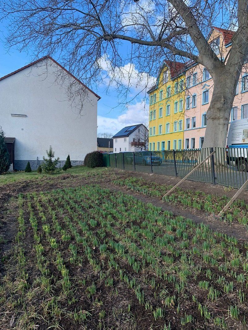 Unweit des Dorfplatzes vor der Kita Zwergenland an der Engelsdorfer Str. 120-128 gibt es eine Fläche, die jahrelang durch einen älteren Herrn umfangreich bewirtschaftet wurde. Viele Anwohner erfreuten sich an den stets gepflegten Beetflächen des fleißigen Gärtners. Bis ins hohe Alter ging dieser seiner Tätigkeit nach. Mit dessen Tod fand auch die Bewirtschaftung ein Ende und die Flächen lagen seit 2021 brach.