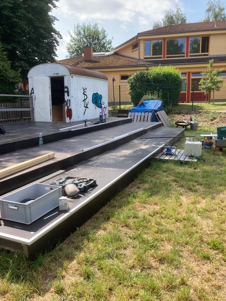 Unser örtlicher Parkettlegemeiseter Andreas Rümmler ist unser guter Geist in Sachen Holzbau. Die Bühne hat nach einem herbstlichen Unterbau jetzt den wasserfesten Aufbau bekommen und steht zur Nutzung bereit. Die Bauwagen wurden gekerchert und werden dann Instand gesetzt. Ein fröhlicher Anstrich erfolgt sicher noch in diesem Jahr.