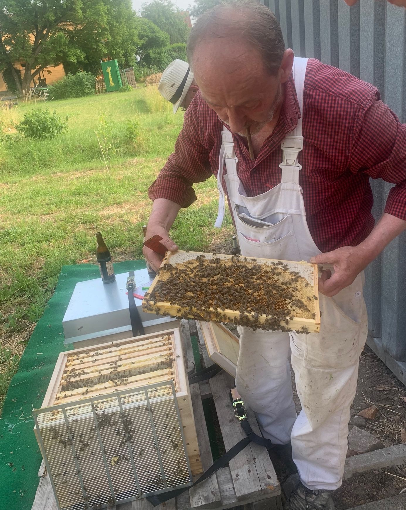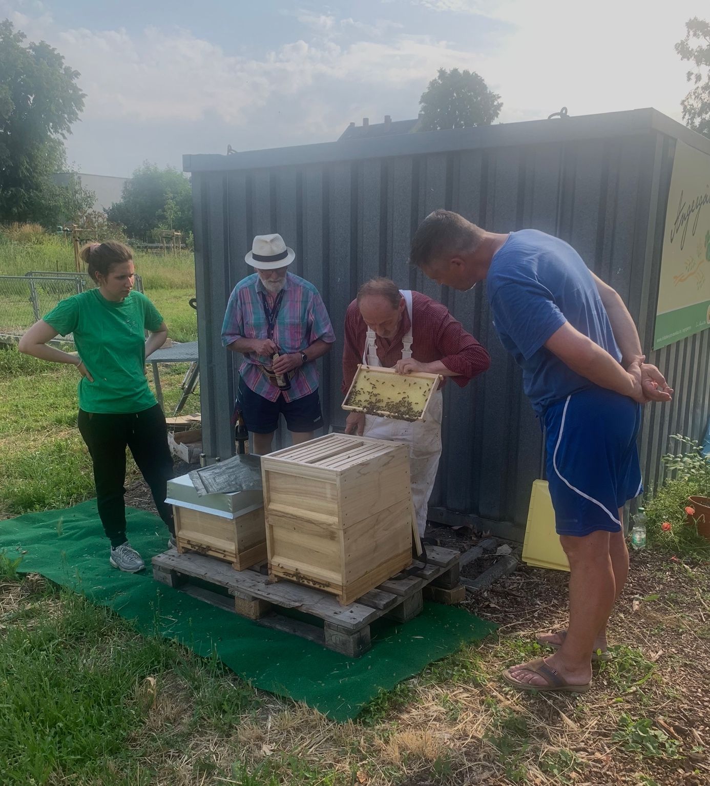 Aber das ist noch nicht alles. Vor drei Wochen hat Herr Büsselberg zwei Beuten mit zwei Bienenvölkern aufgestellt und wir konnten uns von der fleißigen Arbeit der Bienen überzeugen. Es könnte sein, dass wir bald Lindenblütenhonig ernten können. Unser zukünftiges Imkerteam ist der Einweisung durch den Fachmann aufmerksam gefolgt. Es ist spannend über diese Insekten und ihre Arbeit zu erfahren und wir freuen uns, zur Erhaltung unserer Lebensgrundlage beitragen zu können.