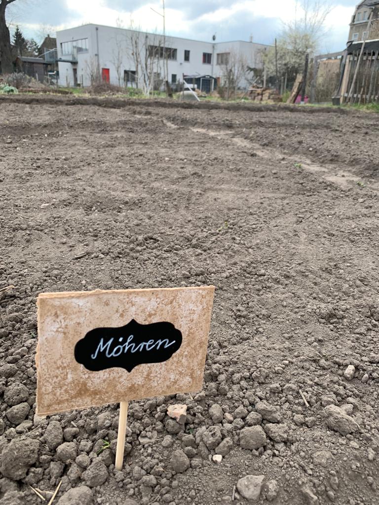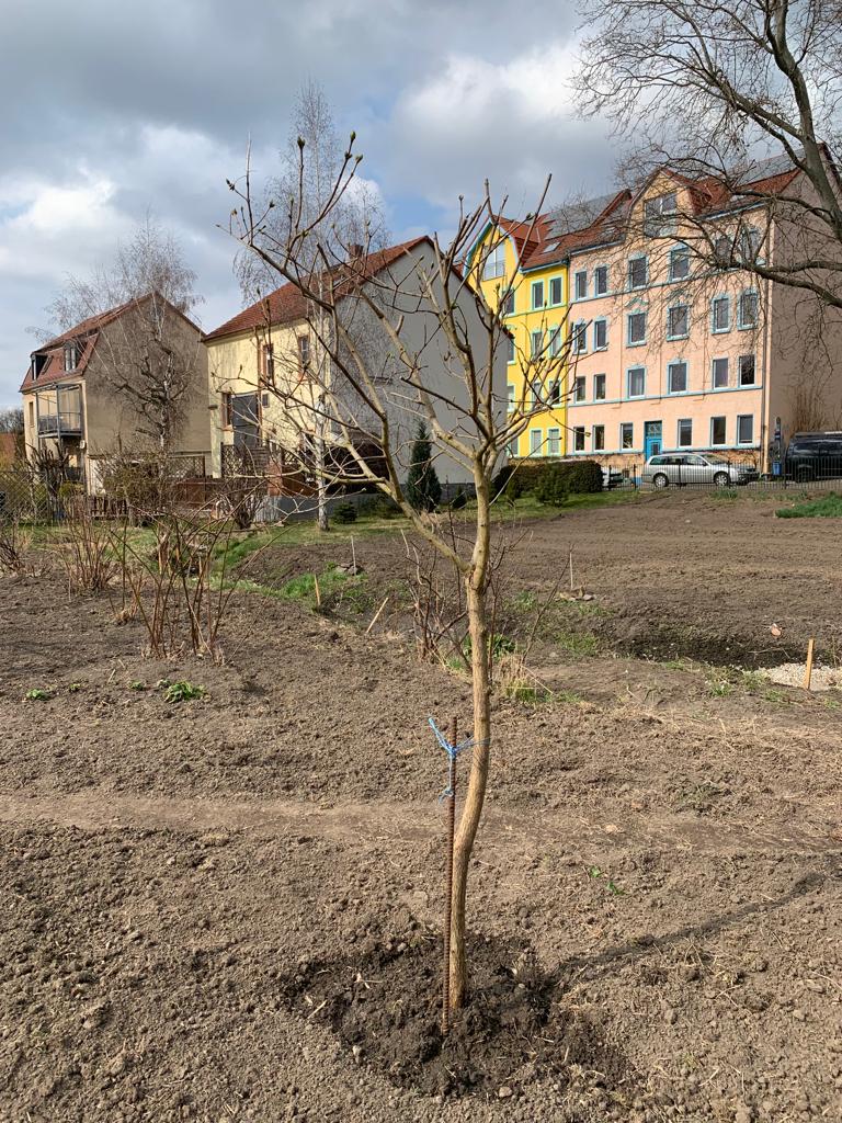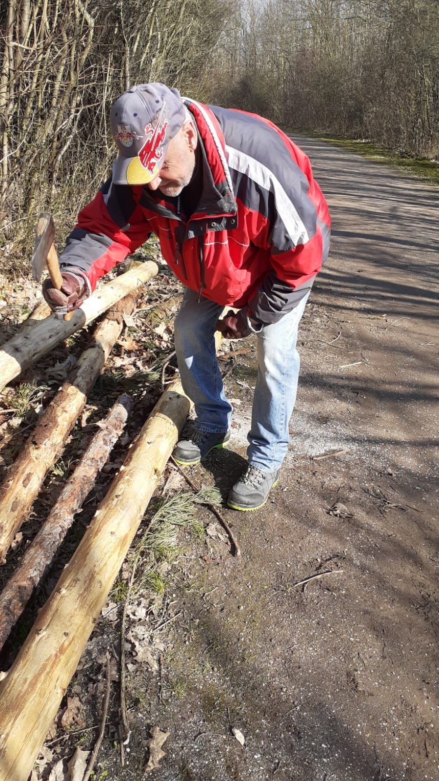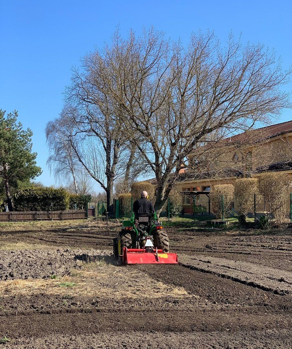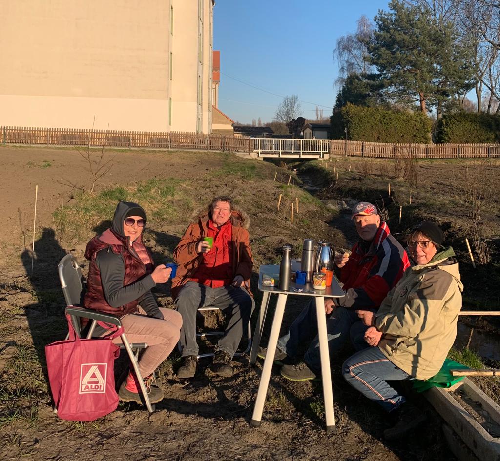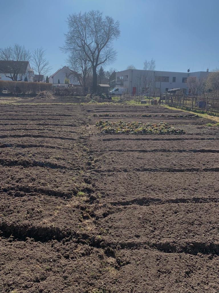 Entsprechend unserem Mölkauer Wappen wurde in den Angergärten richtig geackert. Einmal mit Unterstützung von Technik, die den Boden mulchte, ebnete und gut für eine erste Saat vorbereitete. Und natürlich von den Gärtnerinnen und Gärtnern, die kleine Wege und Beete anlegten. Wieder andere Helfer haben sich um Holzstangen gekümmert, die zur Eingrenzung unserer Komposthaufen genutzt werden sollen und ein bisschen Gestaltung auf die große Fläche bringen.