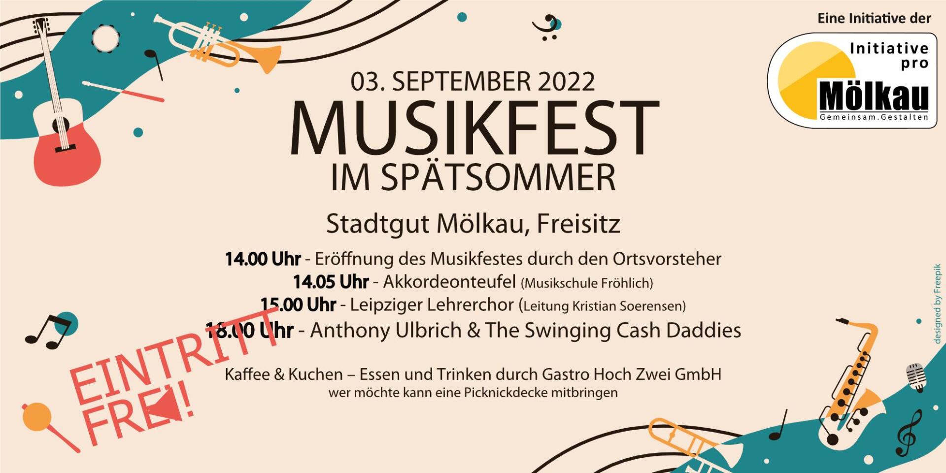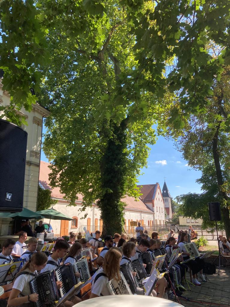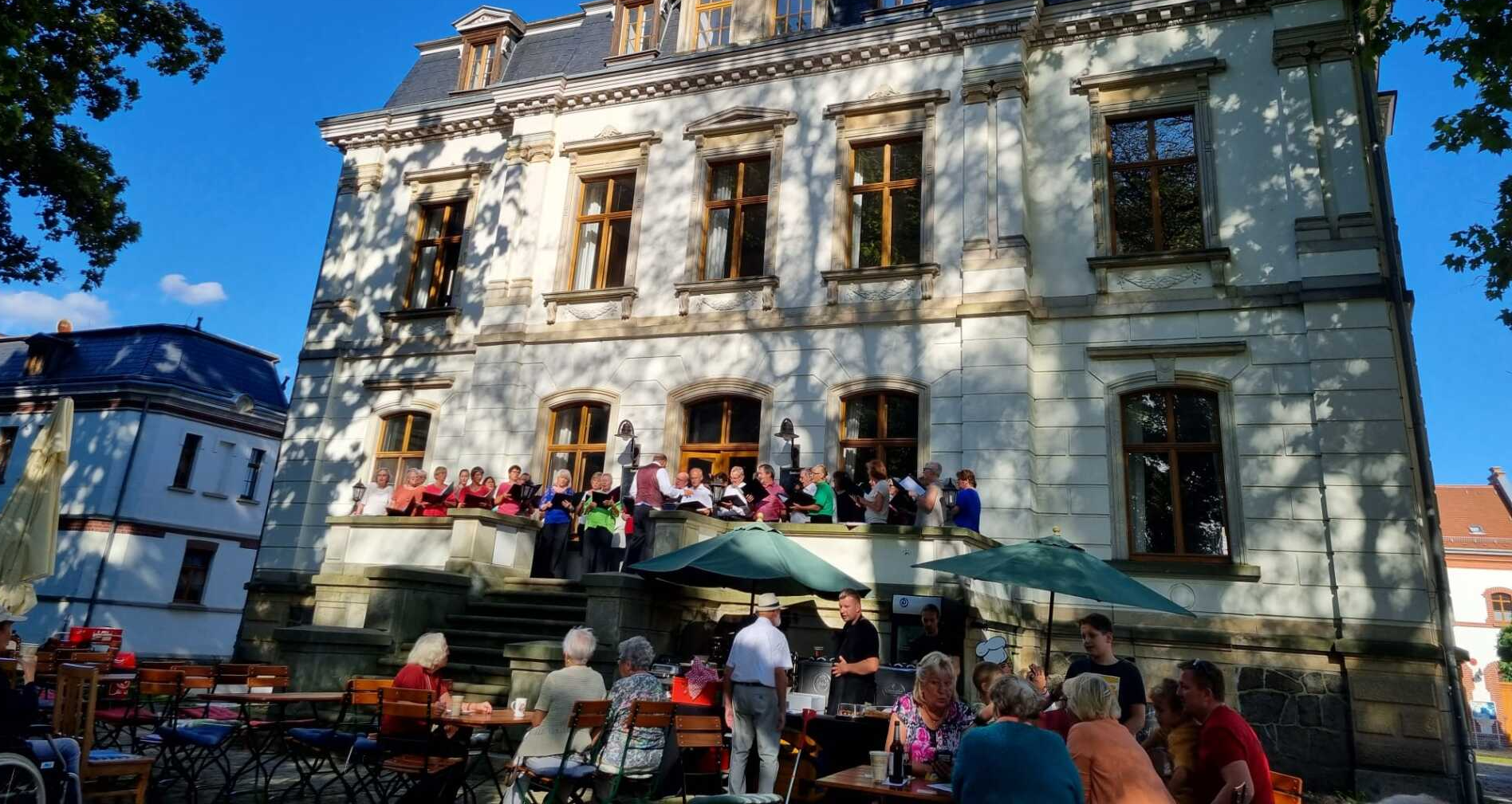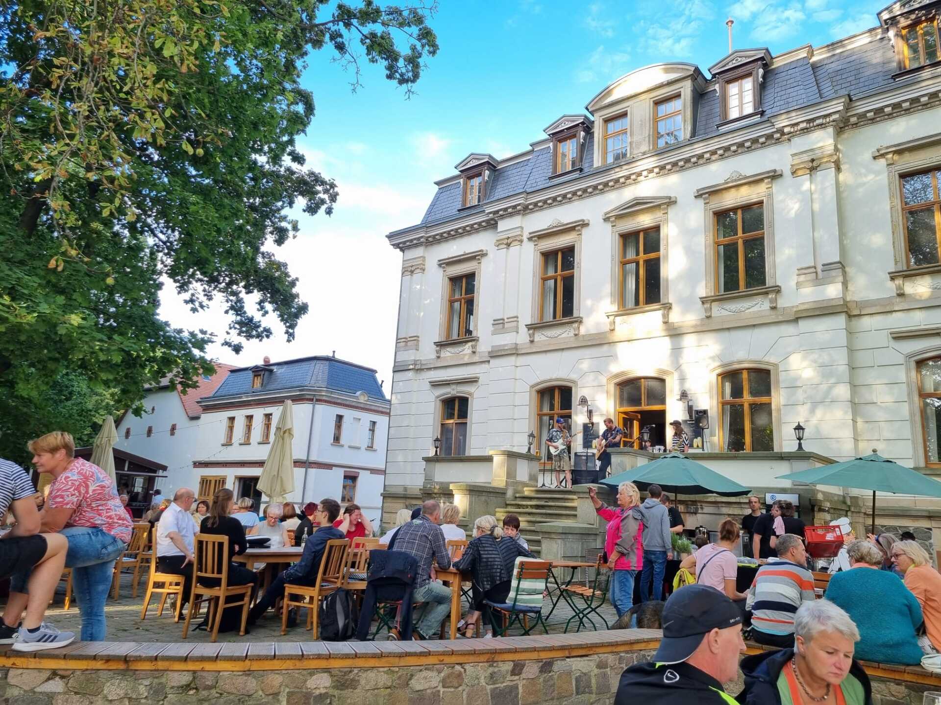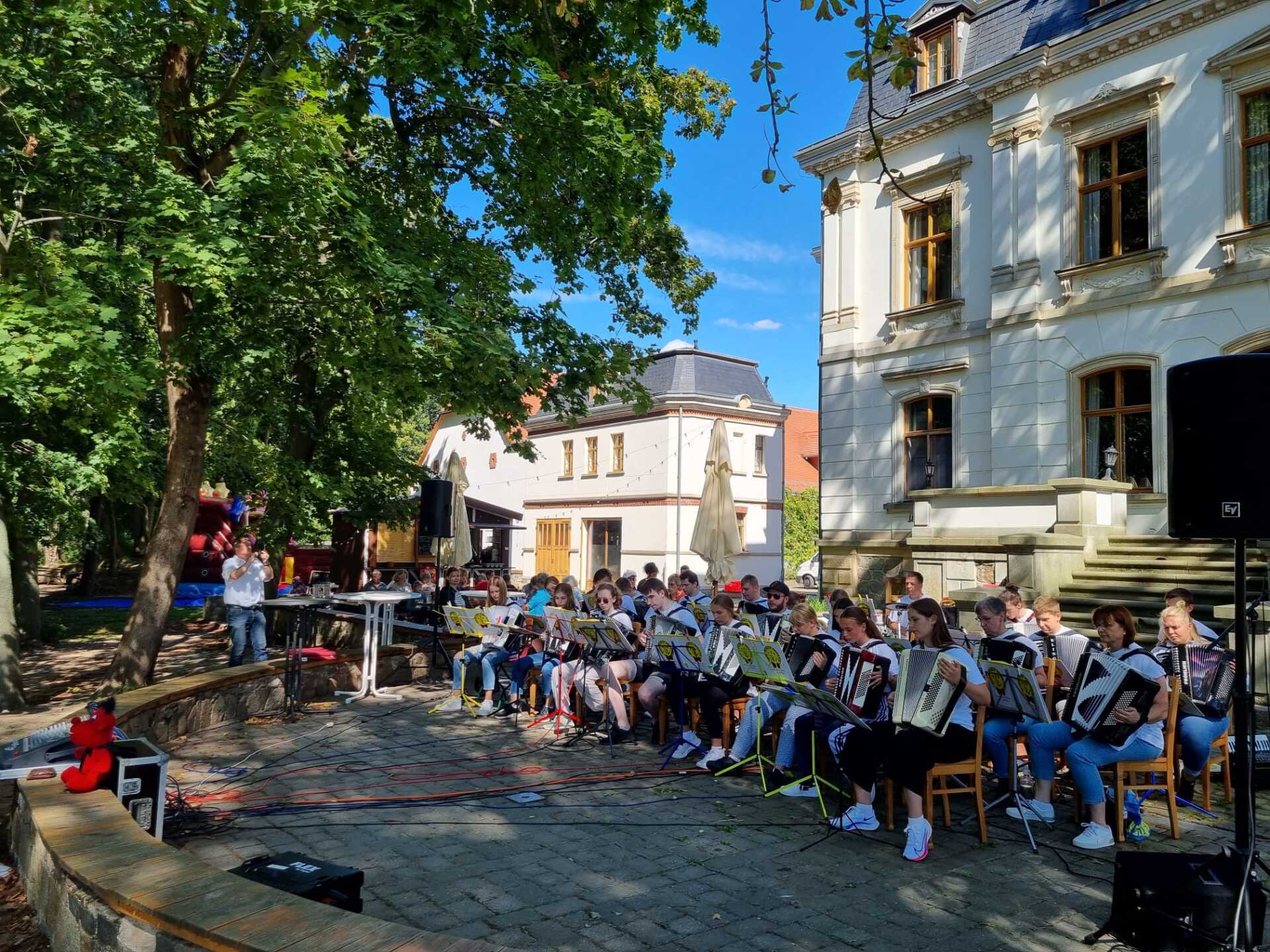 Am Samstag, den 03.09.22 fand kurzerhand ein Musikfest auf dem Freisitz des Stadtgutes Mölkau statt. Nach der Eröffnung durch unseren Ortsvorsteher Herrn Dietze spielten die AkkordeonTeufel unter Leitung von Frau Häcker auf und brachten die Gäste in Stimmung. Viele kennen ja die Musikschule Fröhlich, deshalb auch unter den Mölkauer Eltern und Kindern gut bekannt. Danach folgte der Leipziger Lehrerchor unter Leitung von Herrn Christian Soerensen – bekannt durch Gewandhaus und anderen Auftritten. Der Chor brachte viele alte Volkslieder wunderschön zum Vortrag und regte auch die Gäste zum mitsingen an.