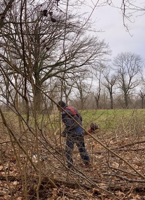 In den letzten Jahren sind die großen Wiesenflächen stark verbuscht und immer kleiner geworden, sowie die verschiedenen Gräben stark zugewachsen. Diese wurden in den letzten Wochen von vielen Freiwilligen freigeschnitten, teilweise mit Unterstützung eines großen Forstmulchers. Auf den nun wieder freien Flächen sollen später durch Aussaat wieder Wiesen entstehen. Die abgeschnittenen Gehölze werden zeitnah gehäckselt oder zu Benjeshecken aufgeschichtet und bieten somit Tieren zukünftig einen Unterschlupf.