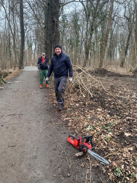 Eine schlagkräftige Truppe, die das Areal schon in ein ansehnliches und parkähnliches Gelände verwandelten. Sie legten Sichtachsen entlang der Rietzschke frei und beseitigten den Unterwuchs an den Solitärbäumen, die nun wieder in voller Pracht erstrahlen können, nachdem auch die Wege freigekehrt wurden.